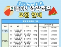 여름방학 프로그램 ‘다놀자! 방학캠프’ 참가자 모집 포스터(사진=경기도)[경기뉴스탑(수원)=장동근 기자]경기도와 경기도평생교육진흥원이 운영하는 경기미래교육캠퍼스에서 오는 23일부터 여름방학 프로그램 ‘다놀자! 방학캠프’ 참가자를 모집한다. 주요 프로그램은 ▲원어민 선생님과 함께하는 체험형 영어프로그램 ▲AI...