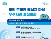 ‘에너지 마을 우수사례 경진대회’ 참가 마을 모집 포스터(사진=경기도)[경기뉴스탑(수원)=장동근 기자]경기도가 주민 주도의 에너지 전환 모델을 발굴하고 공유하기 위해 ‘에너지 마을 우수사례 경진대회’ 참가 마을을 오는 16일부터 20일까지 모집한다고 4일 밝혔다.‘에너지 마을’은 태양광 등 신재생에너지 설비를...