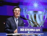 10일 오후 경기도청 1층 다산홀에서 열린 2024 경기도체육상 시상식에서 김동연 경기도지사가 축사를 하고 있다.(사진=경기도)[경기뉴스탑(수원)=장동근 기자]김동연 경기도지사가 ‘경기도체육상’ 시상식에 참석해 체육인들 격려하고 경기체육 발전을 위한 지원을 다짐했다. 김동연 지사는 10일 경기도청 다산홀에서 열린 경기도체육...