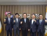 조용익 부천시장(왼쪽에서 두 번째)이 간담회 참석자들이 기념사진을 촬영하고 있다. (좌측부터 차례로 김기표 국회의원, 조용익 부천시장, 임태희 경기도교육감, 서영석 국회의원, 이건태 국회의원)(사진=시흥시)[경기뉴스탑(부천)=육영미 기자]조용익 부천시장은 10일 임태희 경기도교육감을 만나 부천 과학고등학교 입학생의 50%를 관내 학...