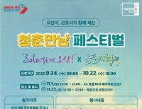 '오산시-군포시 청춘만남 페스티벌' 포스터(사진=군포시)[경기뉴스탑(오산)=전순애 기자]오산시와 군포시가 청년들의 건전한 만남을 지역 차원에서 지원하기 위해 손을 맞잡았다. 오는 11월 열리는 ‘청춘만남 페스티벌 – SOLO만 오산×군포시럽’은 두 도시가 공동으로 기획·운영하는 첫 청년 교류 행사로, 단순한 만...