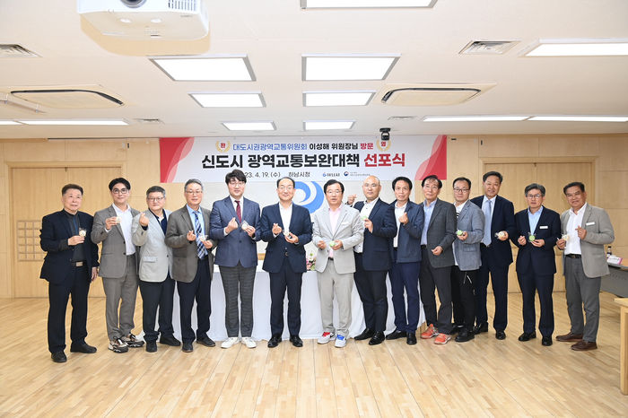 이현재 하남시장이 지난해 4월 시청 상황실에서 국토교통부 대도시권광역교통위원장, 주민들과 함께 신도시 광역교통보완대책 선포식에 참석해 기념촬영을 하고 있다. (사진=하남시 제공)