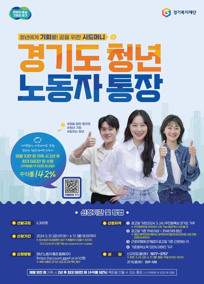 ‘경기도 청년 노동자 통장’은 청년이 24개월 동안 근로활동을 유지하면서 매달 10만원을 저축하면 경기도 지원금을 합쳐 약 580만원(지역화폐 100만원 포함)의 목돈을 마련하는 청년지원 사업이다.