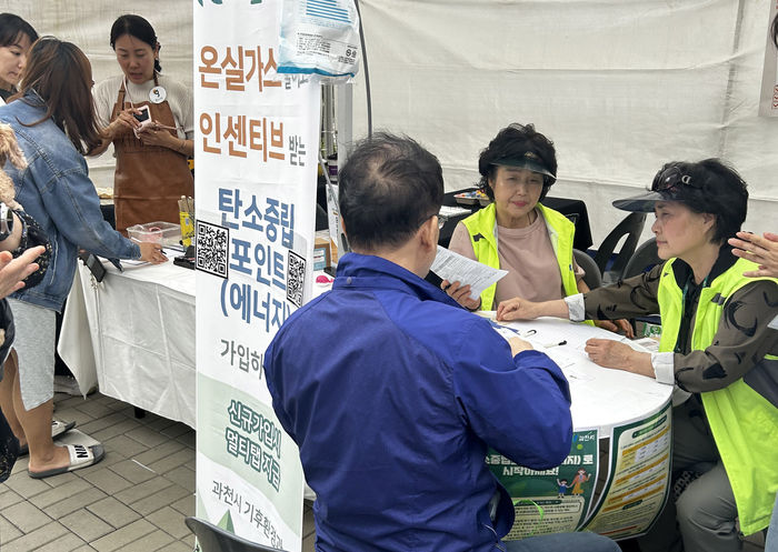 관내 행사에 마련된 홍보 부스에서 시민에게 참여 신청을 독려하고 있다.(사진=과천시 제공)