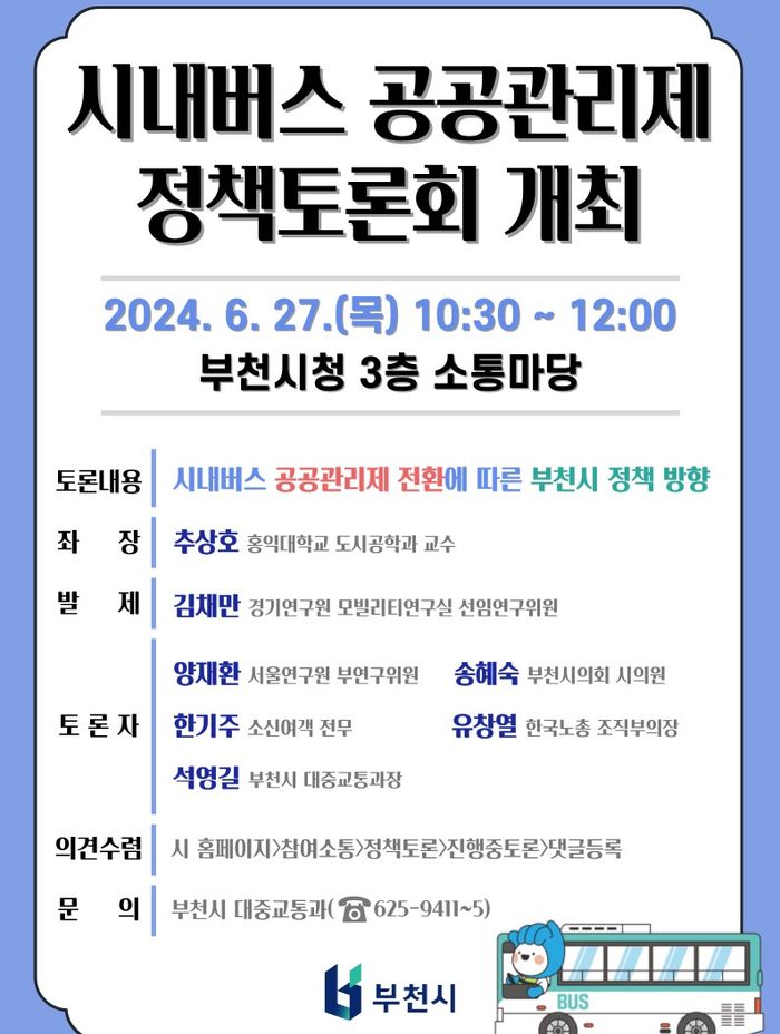 [경기뉴스탑(부천)=육영미 기자]부천시는 오는 6월 27일 오전 10시 30분 부천시청 3층 소통마당에서 ‘부천시 시내버스 공공관리제 정책토론회’를 개최한다.