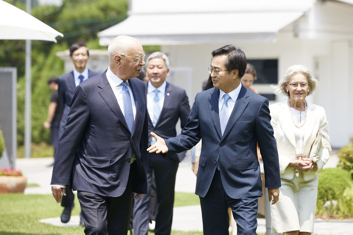 김동연 경기도지사가 지난 6월 28일 ‘4차산업혁명센터 설립에 관한 협력협약'을 체결하기 위해 클라우스 슈밥 세계경제포럼(WEF) 회장과 도담소로 이동하고 있다.(사진=경기도 제공)
