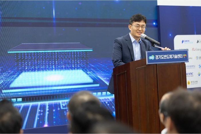 2일 오후 차세대융합기술원에서 열린 경기도 반도체 기술센터 개소식에서 김현곤 경제부지사가 인사말을 하고 있다.(사진=경기도 제공)