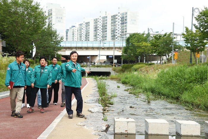 이날 점검 장소는 왕곡천과 오전동 일대로 2022년 기록적인 폭우로 피해를 입었던 곳이며, 현장에서 침수 방지 대책에 대한 보고를 받고 집중호우에 대한 대비 사항을 꼼꼼히 점검했다.