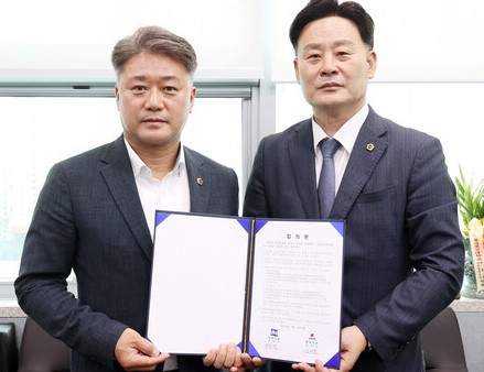 최종현 경기도의회 더불어민주당 대표의원과 김정호 국민의힘 대표의원이 15일 제11대 도의회 후반기 원 구성에 합의문에 서명하고 기념촬영을 하고 있다. (사진=경기도의회 제공)