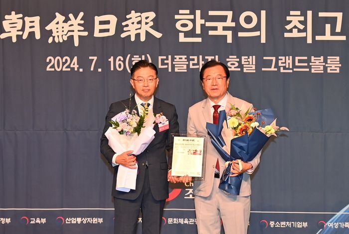 이현재 하남시장(사진 오른쪽)이 16일 서울 중구 더플라자 호텔 그랜드 볼룸에서 열린 「2024 한국의 최고 경영대상」에서 하남시를 대표해 ‘가치창조경영’ 부문 대상을 수상한 후 심사위원장인 황인태 중앙대 교수(사진 왼쪽)과 기념사진을 촬영하고 있다.(사진=하남시 제공)