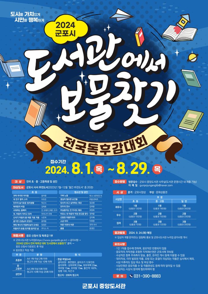 독후감 대회는 전국 초·중·고등학생 및 성인을 대상으로 하며 군포시 도서관의 사서가 추천하는 월간 추천 도서(2023년 7월~12월) 20권 중 한 권을 읽고 독후감을 작성 후 중앙도서관에 직접 방문 또는 이메일(gunpojunganglib@naver.com)로 제출하면 된다. 군포시도서관 누리집 공지사항에서 ‘2024년 군포시 전국 독후감 대회 ’도서관에서 보물찾기‘ 개최 안내’를 클릭하고 첨부파일의 응모 신청서 및 독후감 작성양식을 다운받아서 작성하면 된다.