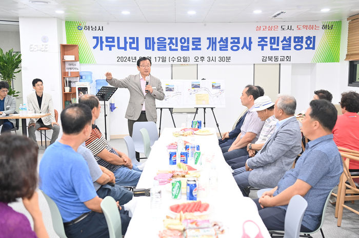 [경기뉴스탑(하남)=박찬분 기자]하남시는 지난 17일 주민설명회를 열고 감북동 주민의 최대 숙원사업인 ‘가무나리 마을진입로 개설공사’ 준공에 따른 교통·보행 편의 증가 효과 등을 설명했다.