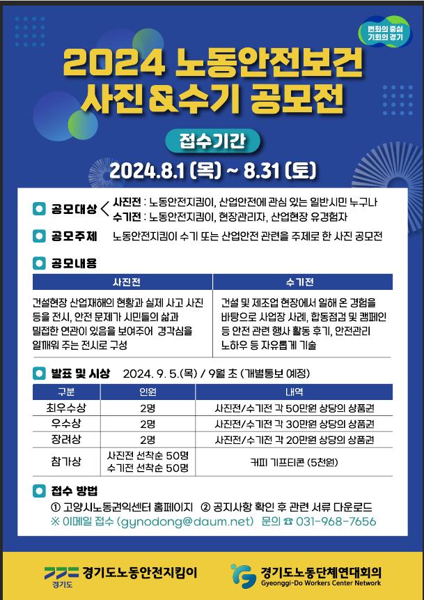 참가 대상도 분야별로 다르다. 사진 분야는 산업안전에 관심 있는 일반 도민 누구나 참여할 수 있으며, 수기 분야는 노동안전지킴이, 현장관리자, 산업현장 유경험자 등 경기도 산업현장에서 안전한 일터 조성을 위해 노력하는 관계자들이 응모할 수 있다.