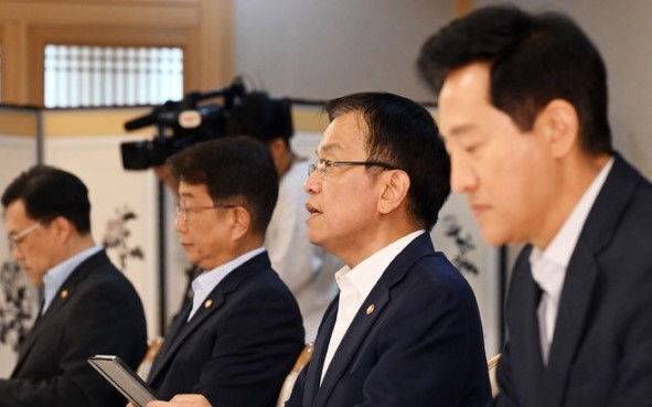 8일 서울 종로구 정부서울청사에서 열린 부동산관계장관회의에서 박상우 국토교통부 장관(왼쪽 부터), 최상목 경제부총리, 오세훈 서울시장, 김병환 금융위원장, 이복현 금감원장이 회의에 앞서 대화하고 있다. (사진 =ⓒ뉴시스 캡처)