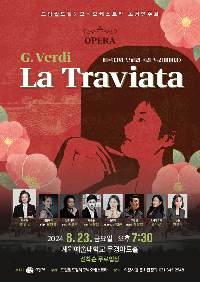 [경기뉴스탑(의왕)=장동근 기자]드림월드필하모닉오케스트라 초청 공연 오페라 ‘라 트라비아타(La Traviata)’가 오는 23일 오후 7시 30분 계원예술대학교 우경아트홀에서 개최한다.