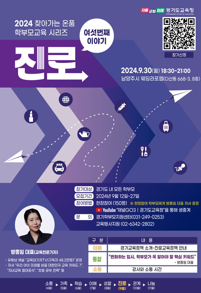 먼저 ▲이해의 시간에는 도교육청 진로교육 정책을 안내하고 학부모의 이해를 돕는다. ▲통찰의 시간에는 방종임 대표(유튜브 교육대기자 TV 운영)가 ‘변화하는 입시, 학부모가 꼭 알아야 할 핵심 키워드’를 주제로 특강을 진행한다. ▲소통의 시간에서는 강연자와 참석자 간 질의응답 시간을 마련해 진로 설계의 핵심 전략과 자녀와의 소통 방법을 공유한다.