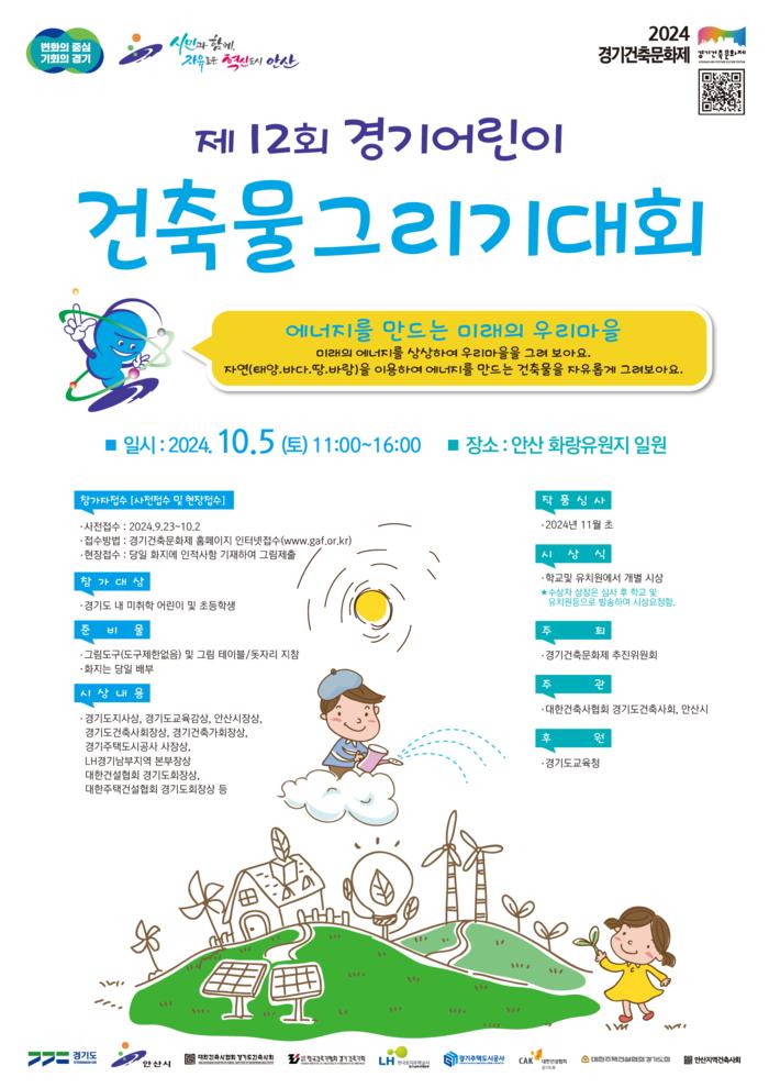 건축에 관심 있는 어린이를 대상으로 ‘어린이건축물그리기대회’가 10월 5일 화랑유원지 야외에서 진행된다. 이번 대회의 주제는 ‘에너지를 만드는 미래의 우리 마을’로, 경기도 내 미취학 아동과 초등학생이 참여할 수 있다. 대회를 통해 아이들은 자신만의 상상력을 발휘해 지속 가능한 미래의 건축물을 그리며, 건축에 대한 흥미와 이해를 높일 수 있을 것이다.