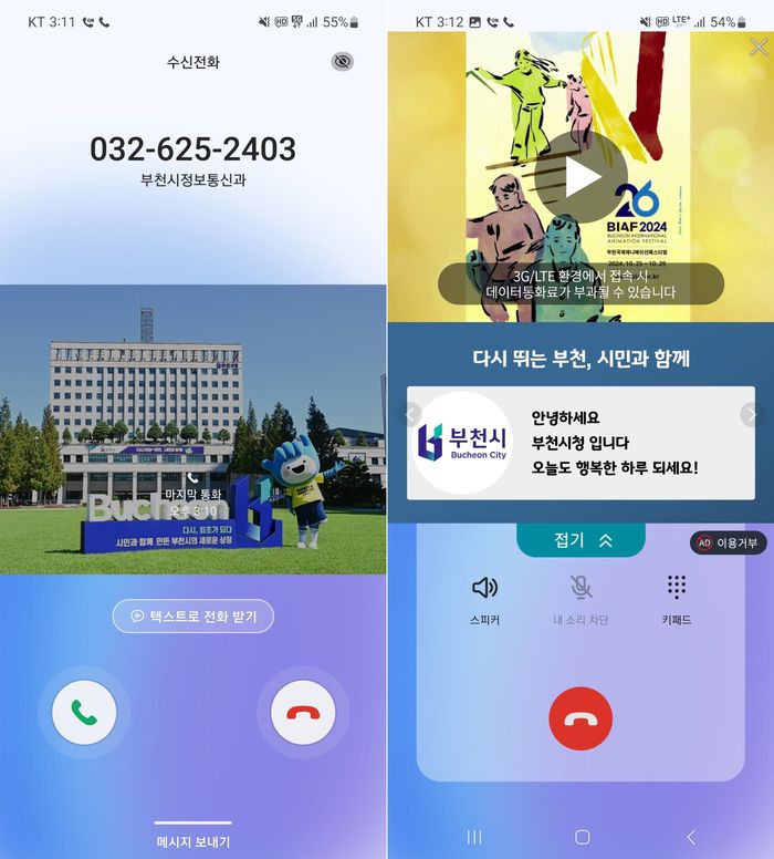 부천시 행정전화 스마트 레터링 서비스 전화 수신 화면(사진=부천시 제공)