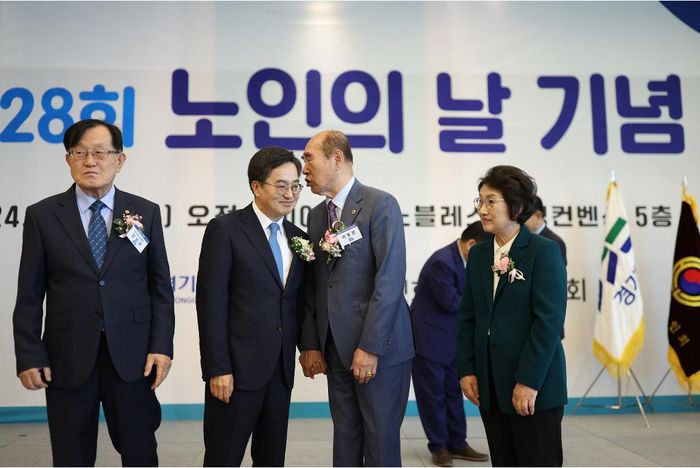 4일 오전 수원 노블레스 웨딩컨벤션에서 열린 제28회 노인의 날 기념식에서 김동연 경기도지사가 이종한 대한노인회 경기도연합회 회장과 이야기를 나누고 있다.(사진=경기도 제공)