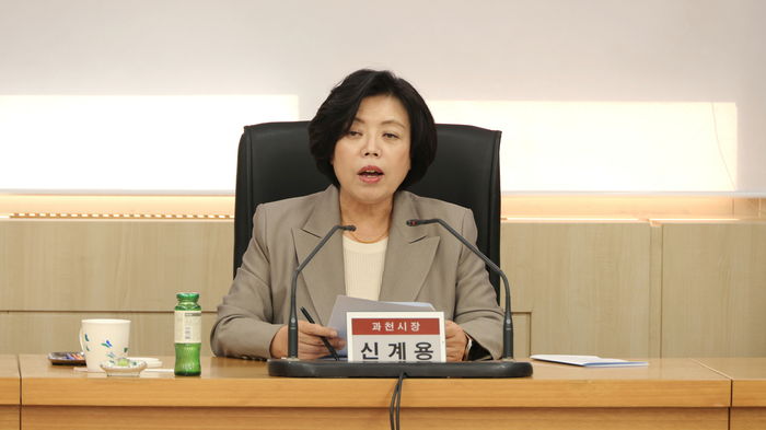 신계용 과천시장이 지난 10일, 시청 상황실에서 푸드테크 클러스터 조성용역 최종보고회에서 발언하고 있다.(사진=과천시 제공)