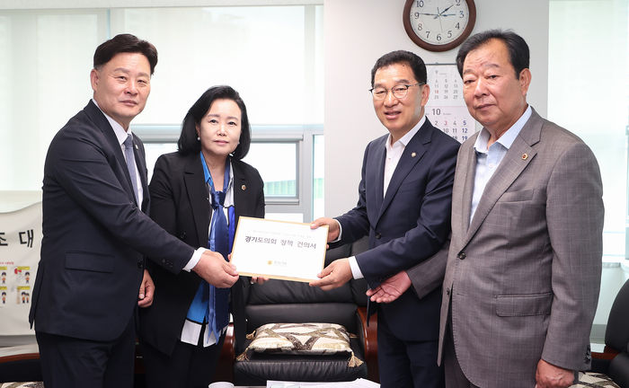 정윤경 부의장(군포1), 더불어민주당 최종현 대표의원(수원7), 국민의힘 임상오 안전행정위원장(동두천2)은 14일 경기도 국정감사 현장에서 행정안전위원회 신정훈 위원장에게 관련 건의서를 전달했다.