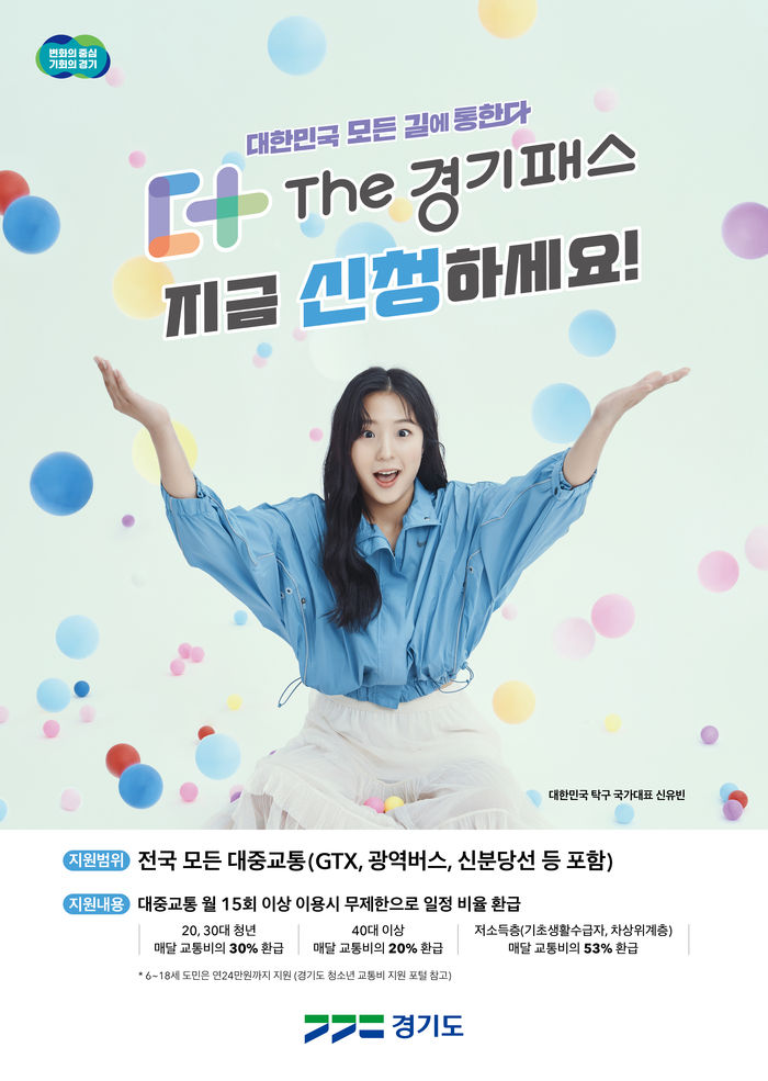 The 경기패스는 K-패스의 월 60회 한도를 무제한으로, 청년의 연령기준을 19~34세에서 19~39세까지 확대해 매달 대중교통 비용의 20~53%(20·30대 청년 30%, 40대 이상 일반 20%, 저소득층 53%)를 환급해 준다. 전국 어디서나 버스·지하철·광역버스·GTX·신분당선 등 대중교통 이용 시 환급받을 수 있다.