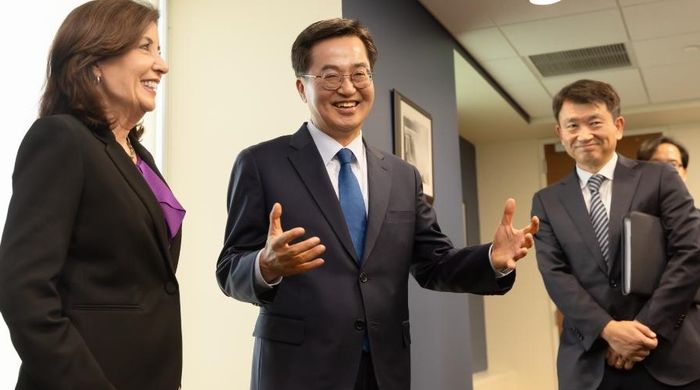 미국 현지시간 17일 오후 뉴욕을 방문한 김동연 경기도지사가 캐시 호컬(Kathy Hochul) 뉴욕 주지사를 만나 면담을 하고 있다.(사진=경기도 제공)