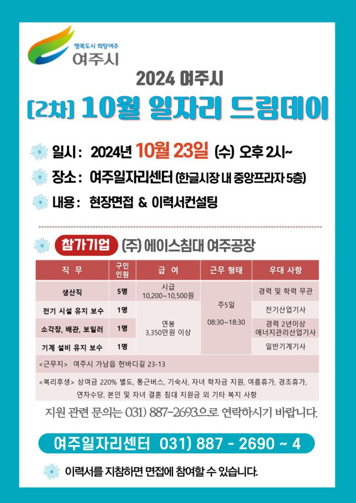 이번 10월 2차 일자리드림데이 구인업체는 가남읍 소재의 ㈜에이스침대 여주공장으로 생산직 5명, 전기 시설직 1명, 배관 및 보일러 관련 직무 1명, 기계설비직 1명을 모집한다.