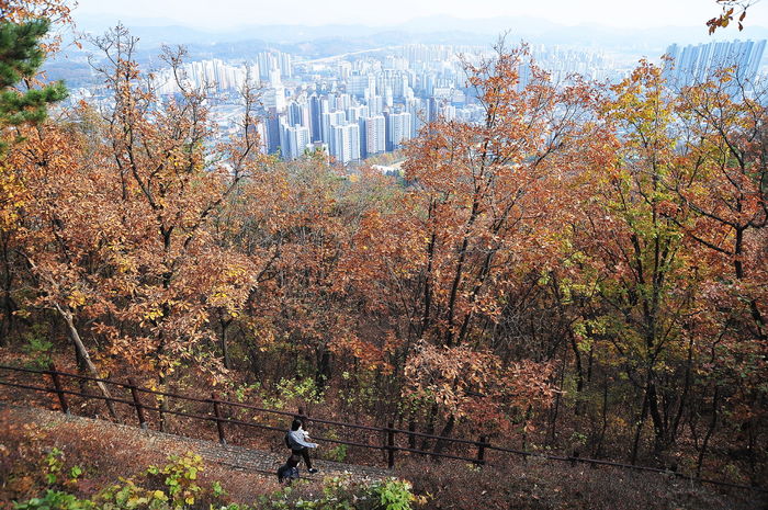 ▲한 시민이 가을색으로 물든 소래산을 오르고 있다.