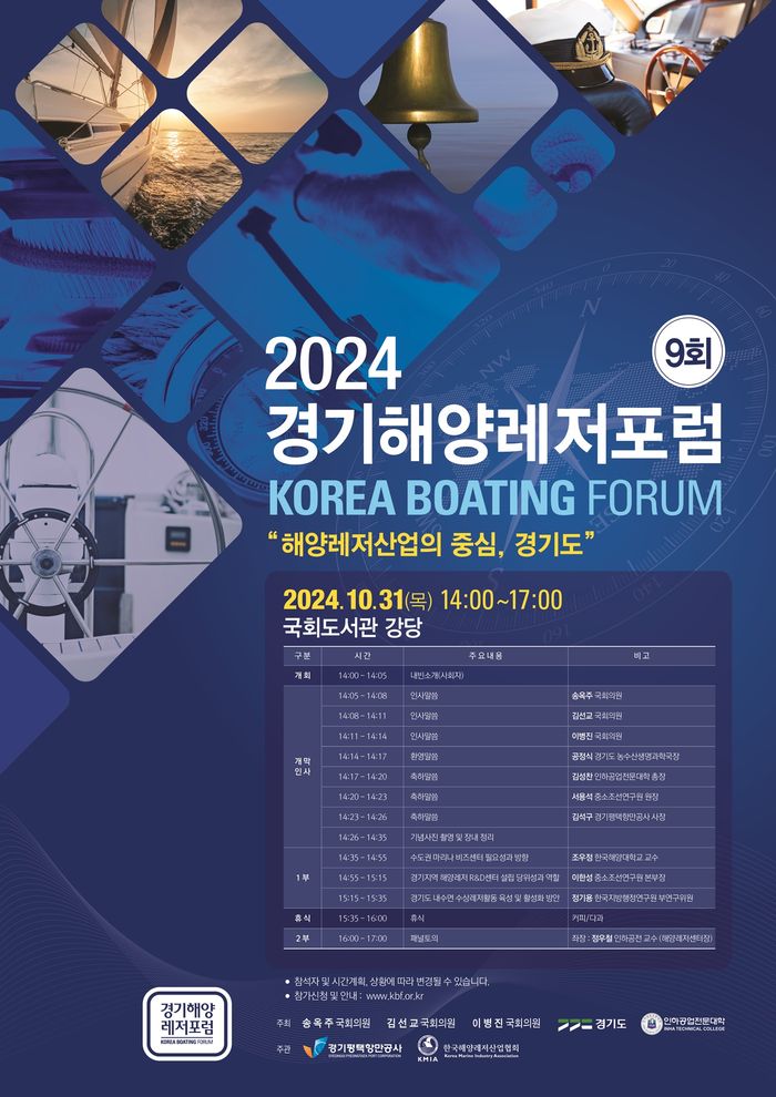 [경기뉴스탑(수원)=전순애 기자]해양레저산업의 지속 성장을 위한 정책 방향을 해양레저 전문가들과 함께 모색해 보는 ‘2024 경기해양레저포럼’이 오는 31일 오후 2시 국회도서관 강당에서 개최된다.