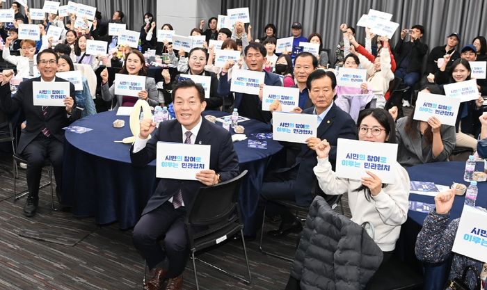 지난 1일 ‘2024 수원 협치 정책 축제’에서 이재준 수원시장과 시민 및 학생들이 민·관 협치를 강조하는 손팻말을 들어 보이고 있다.(사진=수원시 제공)