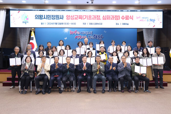 [경기뉴스탑(의왕)=장동근 기자]의왕시는 12일 시청 대회의실에서 의왕시민정원사 기초과정과 심화과정의 수료식을 개최했다고 밝혔다.