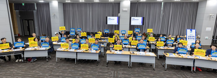 교통정책발전포럼 참석자들이 개인형 이동장치 관련법 제정을 촉구하는 내용이 담김 손팻말을 들고 있다. (사진=수원시 제공)