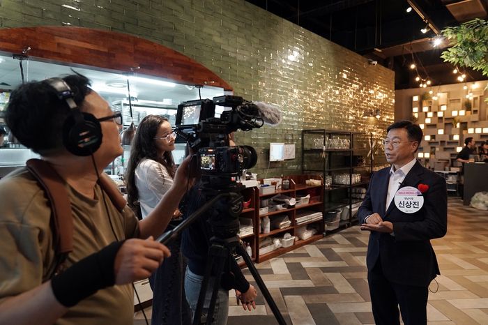신상진 성남시장이 11월 16일 7차 솔로몬의 선택 행사장에서 영국 BBC 취재팀과 인터뷰를 하고있다(사진=성남시 제공)
