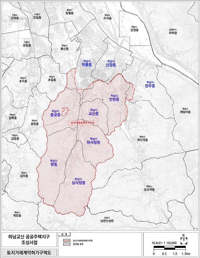 토지거래허가구역 재지정 지역은 국토교통부에서 기존에 2024년 12월25일까지 지정된 하남교산 공공주택지구 및 그 인근지역으로 덕풍동, 신장동, 창우동, 천현동, 춘궁동 일부, 교산동, 항동, 상사창동, 하사창동 전체지역이다.