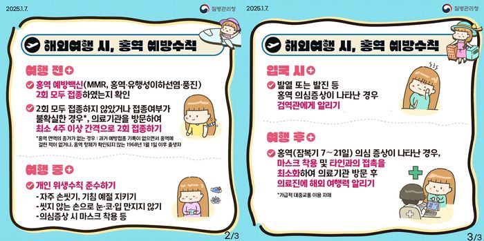 또 여행 후에는 다음과 같은 예방수칙을 준수하여야 한다. ▲입국 시 발열, 발진 등 증상이 있다면 검역관에게 신고해야 하고 ▲도착 후 홍역(잠복기7~21일) 의심 증상(발열 또는 발진 등)이 나타날 경우 마스크 착용 후 의료기관을 방문하여 의료진에게 해외 여행력을 알린 후 진료를 받아야 한다.