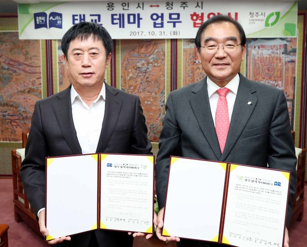 정찬민 용인시장은 31일 오후 청주시청 접견실에서 이승훈 청주시장과 태교를 주제로 업무 협약식을 가졌다. 이번 협약은 지난 2015년 전국 최초로 태교도시를 선포하고 태교 관련 다양한 시책사업을 추진하는 정 시장이 이승훈 청주시장에 제안해 전격 이뤄졌다.
