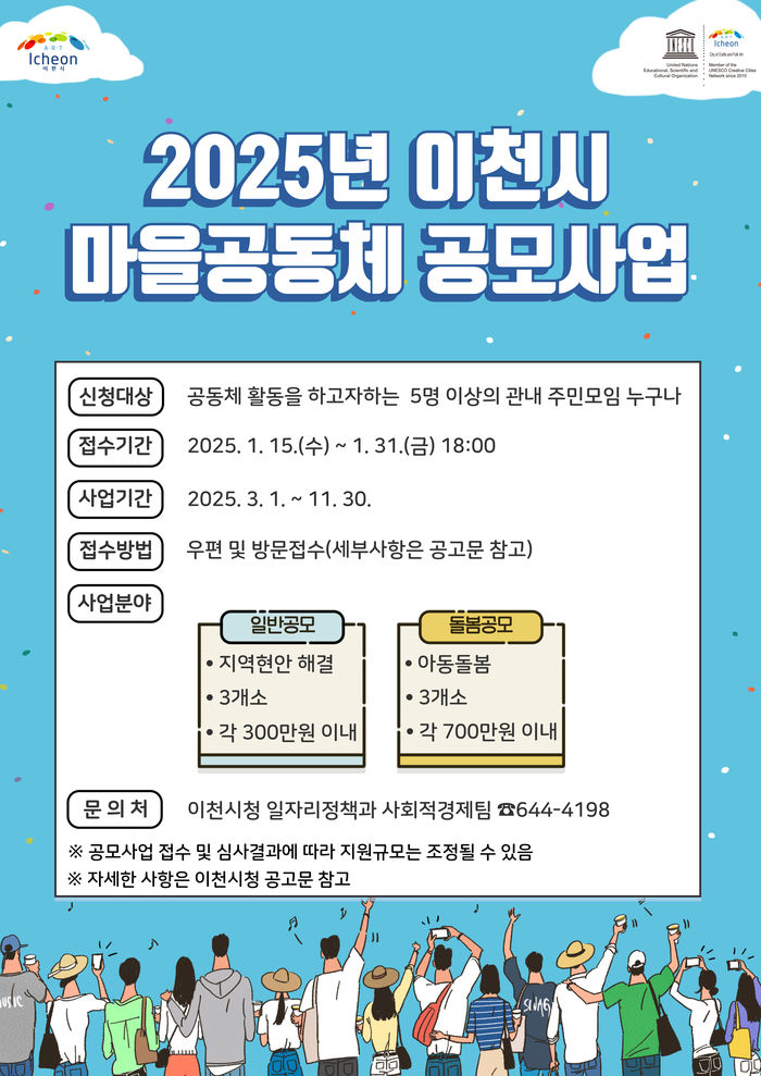 [경기뉴스탑(잋천)=박찬분 기자] 이천시는 2025년 1월 15일부터 1월 31일까지 ‘2025년 이천시 마을공동체 공모사업’에 참여할 공동체를 모집한다.