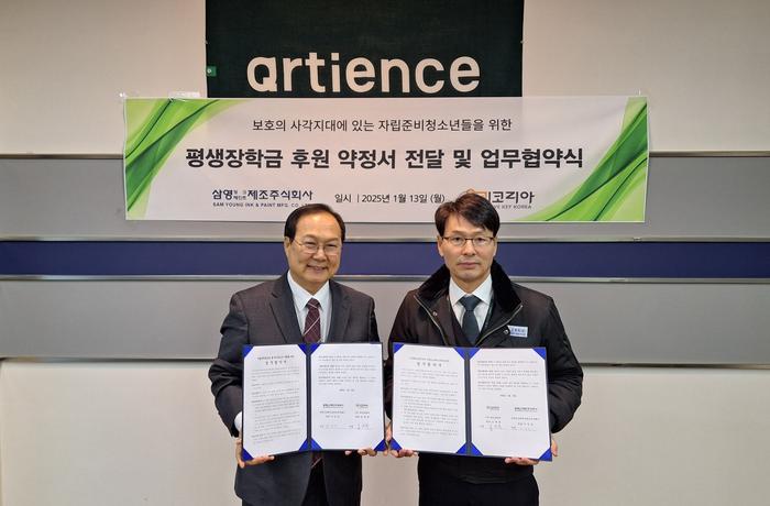 [경기뉴스탑(서울)=전순애 기자]삼영잉크페인트제조주식회사(대표 이강년)가 지난 13일 사단법인 위키코리아(대표 임귀복)와 자립준비청소년 5명을 대상으로 평생장학금을 지원하는 업무협약을 체결하고, 후원 약정서를 전달했다.