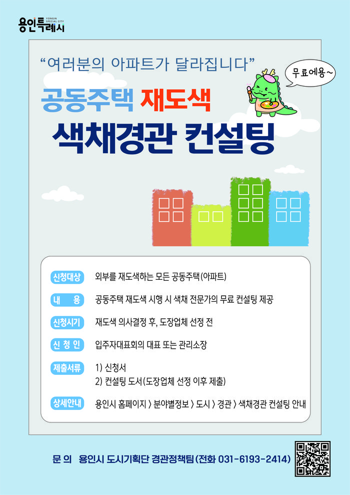 시는 시민 75%가 공동주택에 거주하는 만큼 새로 칠하는 색채 디자인이 ‘2035 용인시 경관계획’에 따라 주변 지역과 어우러지도록 시 소속 경관위원 등 전문가를 활용해 컨설팅할 방침이다.