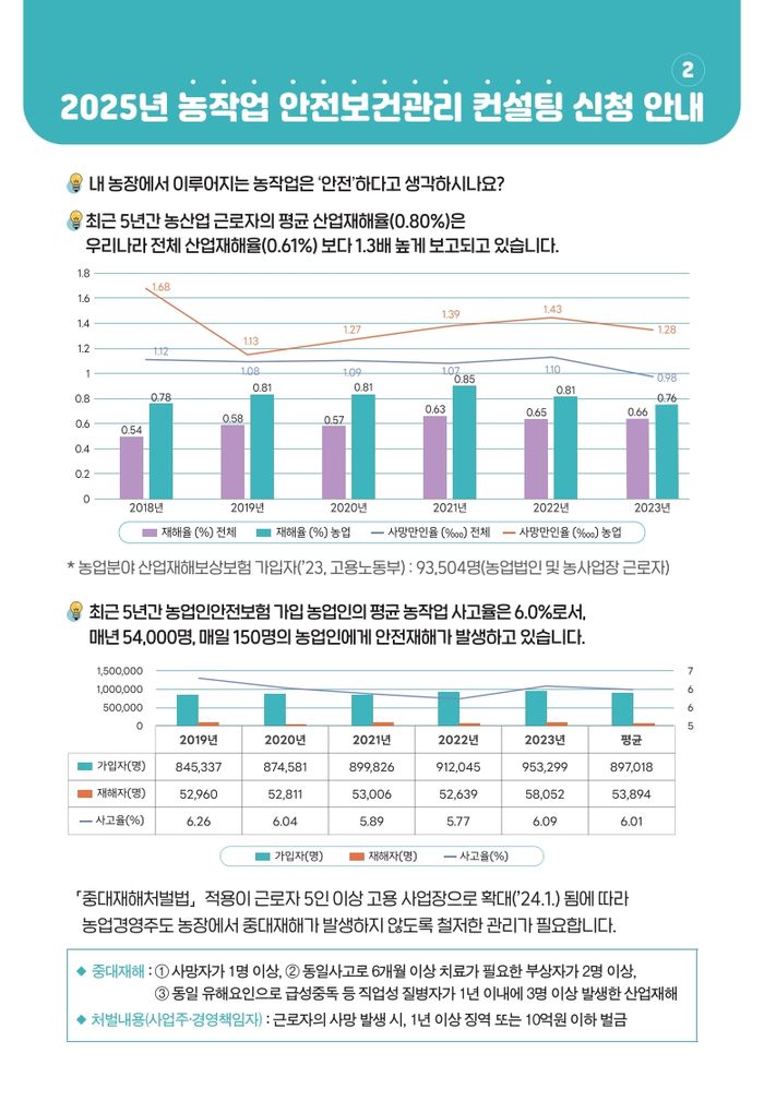 신청대상은 농업인안전보험 가입대상자(가입자 포함)로 5인 내외 농작업 근로자를 고용하거나, 농작업 종사자가 있는 농업경영주다.