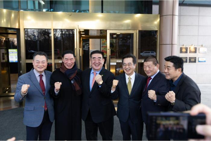 3일 오후 올림픽파크텔에서 열린 제39대 대한유도회 회장 취임식에서 김동연 경기도지사가 조용철 대한유도회 회장 등과 기념촬영을 하고 있다.