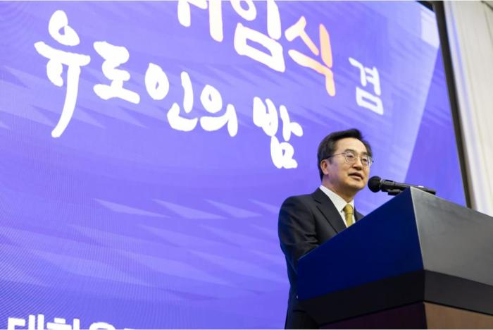 3일 오후 올림픽파크텔에서 열린 제39대 대한유도회 회장 취임식에서 김동연 경기도지사가 인사를 하고 있다.