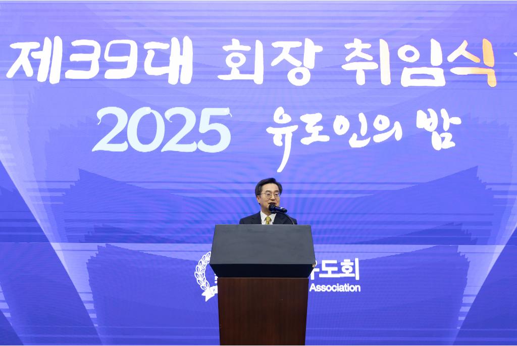 3일 오후 올림픽파크텔에서 열린 제39대 대한유도회 회장 취임식에서 김동연 경기도지사가 인사말을 하고 있다.