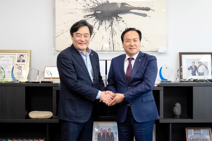 이권재 오산시장이 13일 오후 국민의힘 소속 국회 기획재정위원장 송언석 의원과 국회 행정안전위원회 소속 정동만 의원을 차례로 만나 오산세무지서 신설, 기준인건비 증액 등 지역 주요 현안에 대한 협조를 요청했다.(사진은 이권재 오산시장과 정동만 의원=오산시)