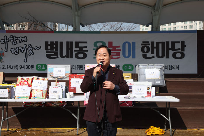 주광덕 남양주시장이 14일 남양주시 별내동 정월 대보름 맞이 척사대회에서 인사말을 하고 있다.(사진=남양주시)