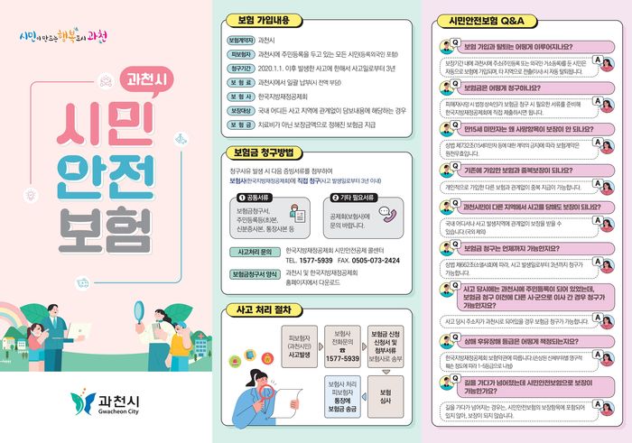신계용 과천시장은 “예측하기 어려운 사고로 피해를 겪은 시민들이 실질적인 혜택을 받을 수 있도록, 시민 눈높이에서 시민안전보험을 지속적으로 확대 운영해 나가겠다”라고 말했다.