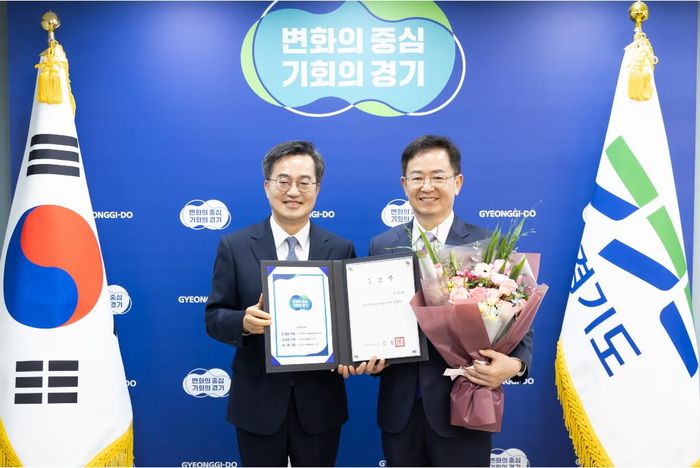 24일 오전 중앙협력본부에서 김동연 경기도지사와 이용빈 경기복지재단 이사장이 기념촬영을 하고 있다.(사진=경기도)