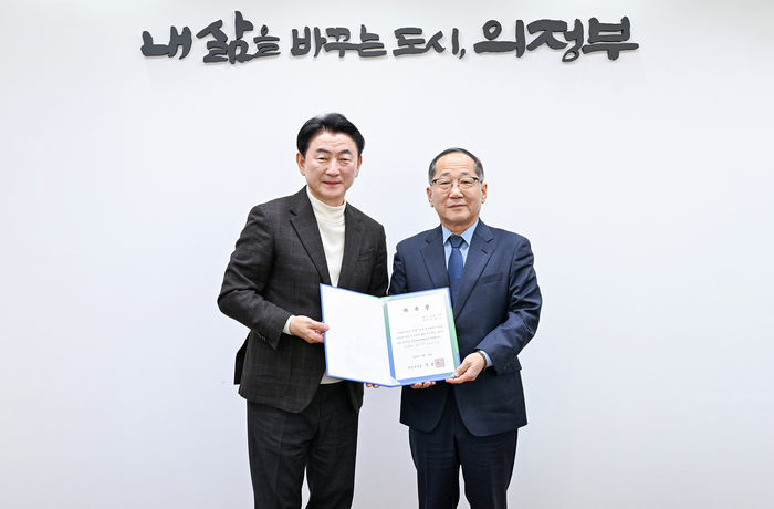 김동근 시장이 2월 26일 임철승 의정부시 청소년지도협의회 시협의회장에게 위촉장을 수여한 뒤 함께 기념사진을 찍고 있다.(사진=의정부시)