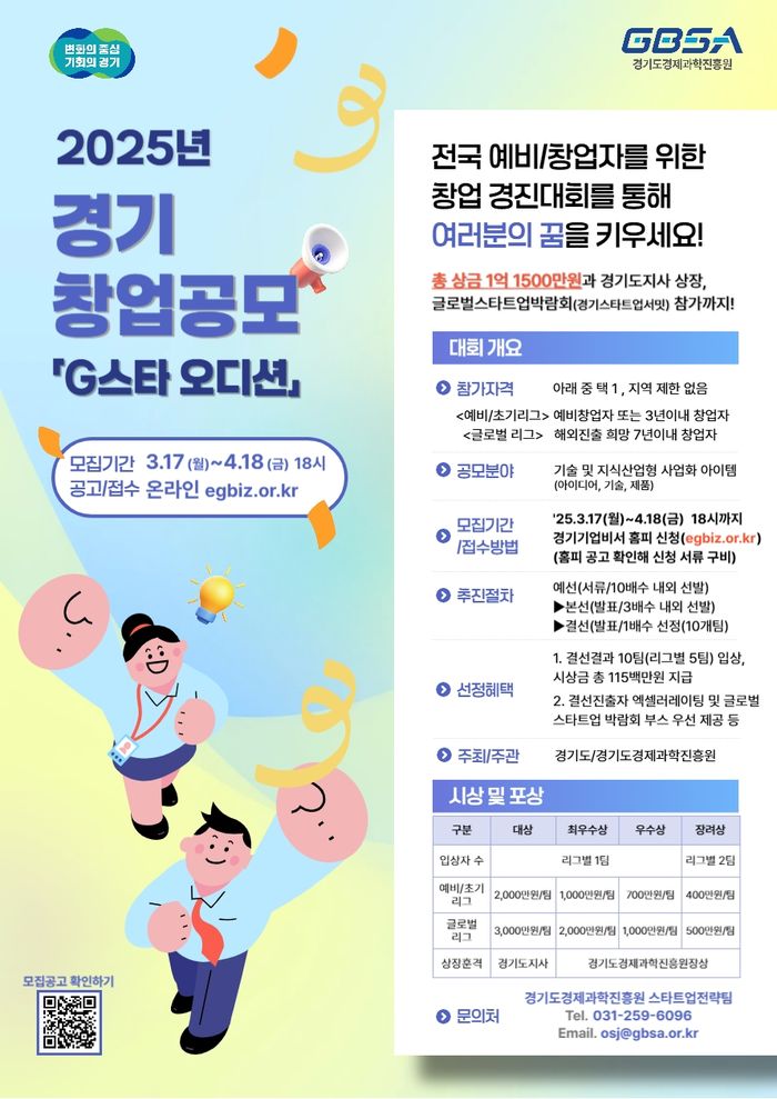 자세한 문의는 경기도경제과학진흥원 스타트업전략팀(031-259-6096) 또는 전자우편(osj@gbsa.or.kr)으로 하면 된다.